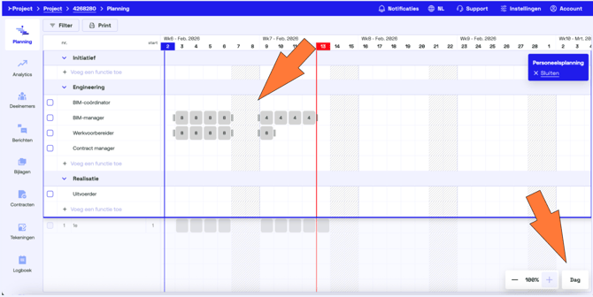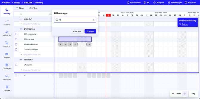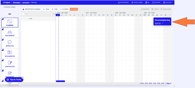 Open het project waarin je personeel wilt plannen en klik op de blauwe knop Personeelsplanning.