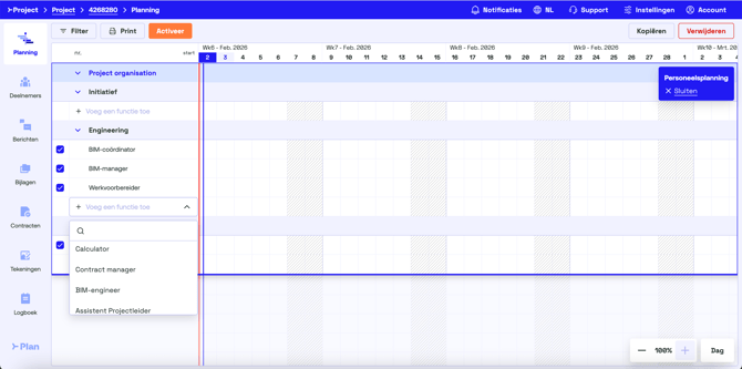 Open de fase Project organisation. Selecteer per fase de benodigde functies door te klikken op + Voeg een functie toe en kies de juiste functie(s).