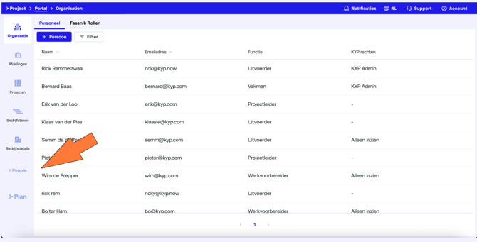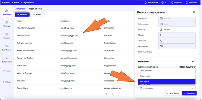 Voeg alle medewerkers binnen je organisatie toe en vul de juiste informatie in. Geef hen vervolgens de juiste rechten. De medewerkers die verantwoordelijk zijn voor het inplannen van personeel geef je KYP Admin-rechten